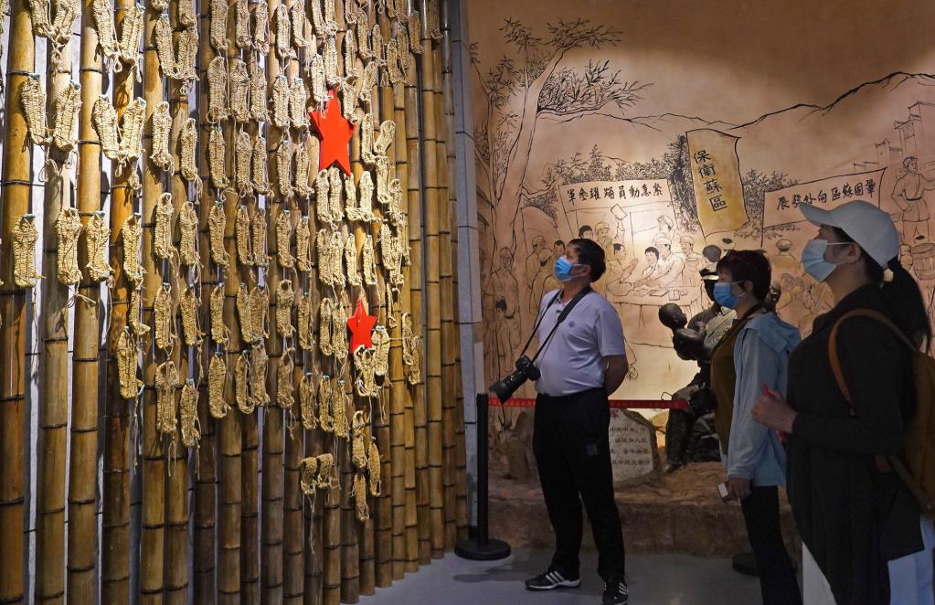 台灣包養網 在江西省于都縣中心赤軍長征動身留念館,游客觀賞芒鞋構成的“芒鞋墻”(2021年4月30日攝)。新華社記者萬象攝